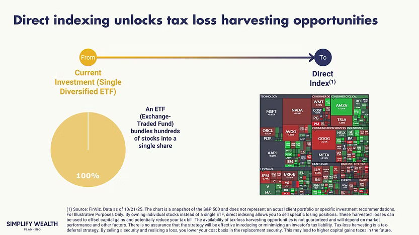 Visual comparison showing a single ETF pie chart versus a direct index portfolio heatmap of individual stocks, explaining how owning individual stocks through direct indexing creates more opportunities for tax-loss harvesting than owning a single ETF.