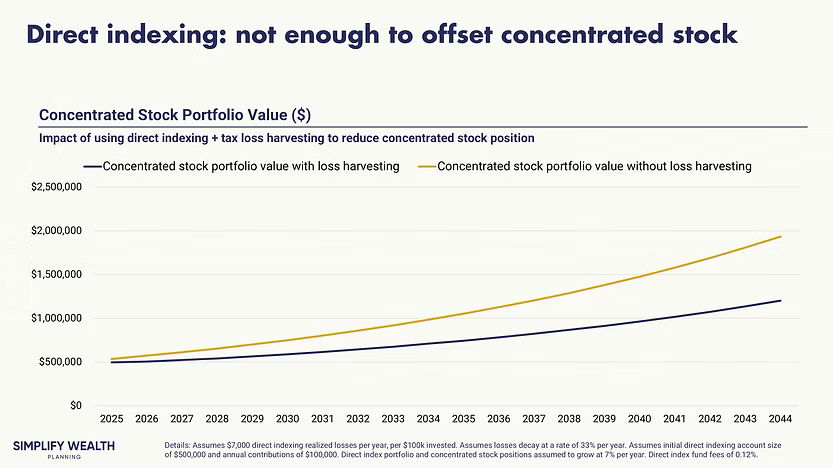 Line chart comparing the value of a concentrated stock position over time with and without tax-loss harvesting via direct indexing, demonstrating that direct indexing alone is insufficient for substantially reducing concentrated stock risk.