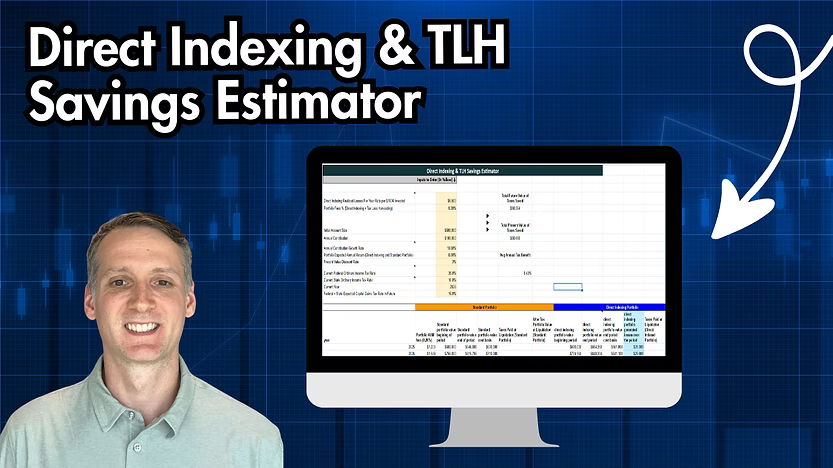 Financial advisor showcasing the Direct Indexing & TLH Savings Estimator spreadsheet tool, a resource for tech professionals to estimate potential tax savings from using direct indexing to offset RSU and ESPP gains.