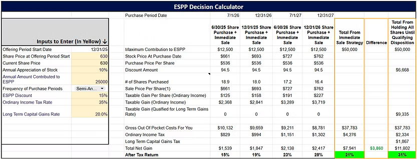 Spreadsheet calculator comparing the after-tax net gain of selling ESPP shares immediately versus holding them for a qualifying disposition, highlighting the tax implications of different ESPP strategies.