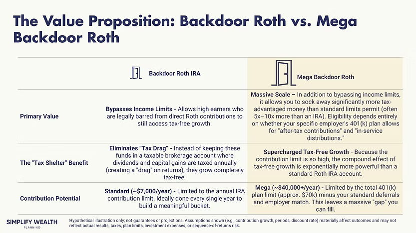 A comparison chart showing the differences between a Backdoor Roth IRA and a Mega Backdoor Roth. The chart highlights that while a standard Backdoor Roth bypasses income limits for annual IRA contributions (approx. $7,000), a Mega Backdoor Roth utilizes after-tax 401(k) contributions to allow for significantly higher savings, potentially filling a massive gap up to the total plan limit.
