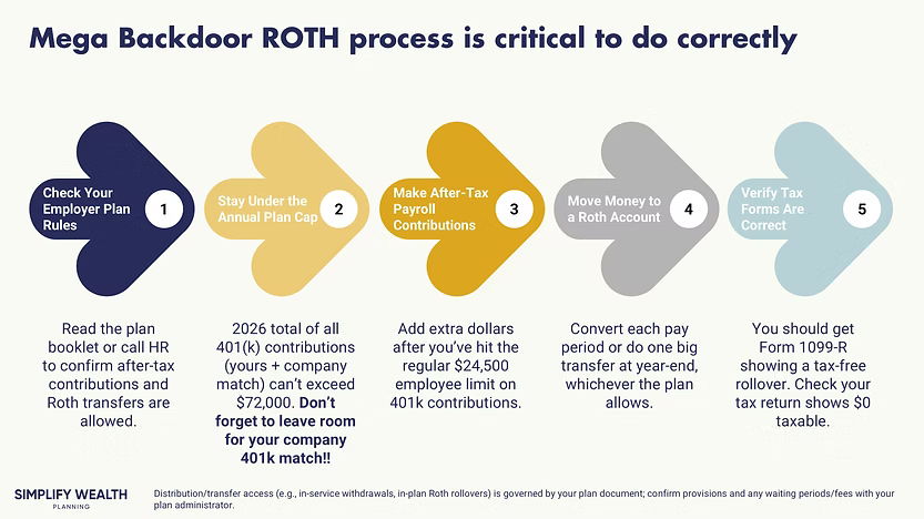 A five-step process diagram for executing a Mega Backdoor Roth. Steps include verifying plan rules for after-tax contributions and in-service distributions, calculating contribution room to stay under the annual cap, making payroll contributions, moving money to a Roth account immediately, and verifying correct tax reporting on Form 1099-R.