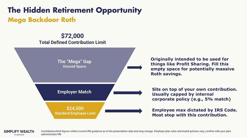 - Bucket 3 is the "Mega Gap." This is the remaining space up to the total IRS limit (which is $72,000 for 2026). This is where After-Tax contributions go. But remember, this bucket is only available if your employer specifically allows for it! We have seen more and more employers offering this each year.