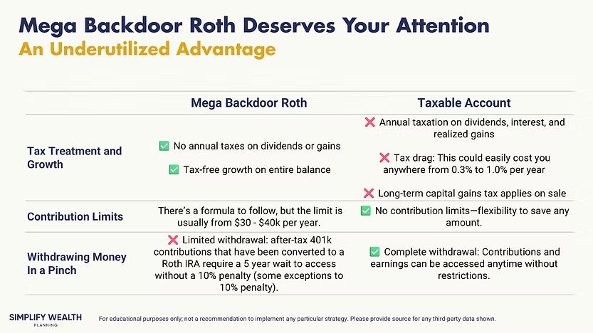 A comparison table highlighting the advantages of a Mega Backdoor Roth over a taxable brokerage account. It contrasts tax treatment (tax-free growth vs annual taxation), contribution limits (formula-based vs none), and liquidity (restricted access vs full liquidity), emphasizing the superior tax efficiency of the Roth strategy for long-term growth.