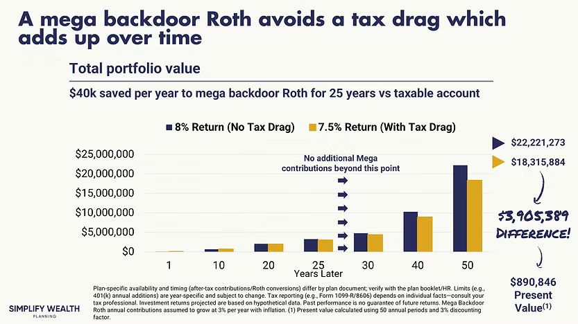 In a Mega Backdoor Roth, you pay zero tax on dividends. Zero tax on rebalancing. And zero tax on withdrawal.